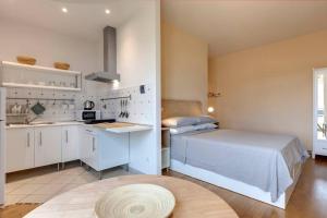 Мини-кухня полностью оснащена современной техникой: варочная панель, холодильник, микроволновая печь и тостер. Также имеются чайник электрический и кофемашина для приготовления чая и кофе вместе со всей необходимой посудой и столовыми принадлежностями. В здании есть лифт до верхних этажей с апартаментами.