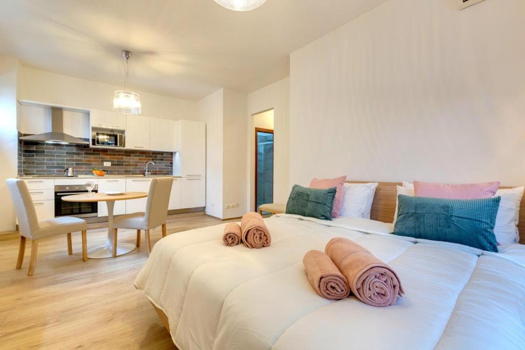 Apartament typu studio z klimatyzacją składa się z jednej sypialni z podłogą wyłożoną parkietem, części wypoczynkowej z telewizorem płaskoekranowym i kanałami kablowymi oraz prywatnej łazienki wyposażonej w prysznic i suszarkę do włosów oraz dodatkowego WC. Aneks kuchenny jest w pełni umeblowany i nowocześnie wyposażony: posiada piekarnik, płytę grzewczą, lodówkę, zmywarkę do naczyń, mikrofalówkę, ekspres do kawy oraz stół jadalny wraz ze wszystkimi niezbędnymi przyborami kuchennymi.